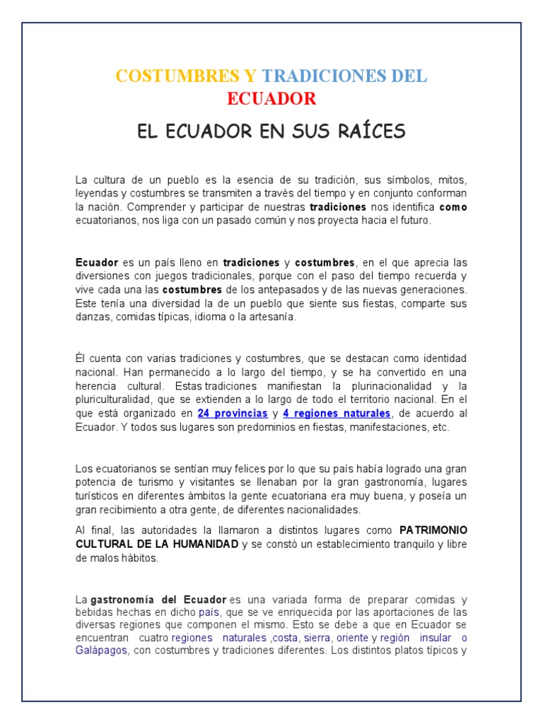 El territorio del perú se divide tradicionalmente en tres regiones regiones naturales diferenciadas por su clima y vegetación, que en orden de oeste a este partiendo desde el océano pacífico son la costa, la sierra y la selva. Son una herencia que podemos dejarle a nuestros hijos y nietos en un futuro cercano. (40%) consulte sobre las mareas diurnas y semidiurpas. El arroz marinero, también conocido como arroz con mariscos, es un plato muy popular no solo en las islas galápagos y ecuador, sino en toda américa. Clasificación de los juegos tradicionales en base a su complejidad.